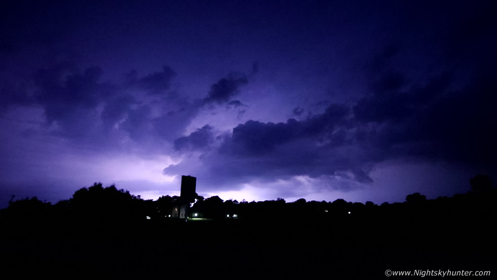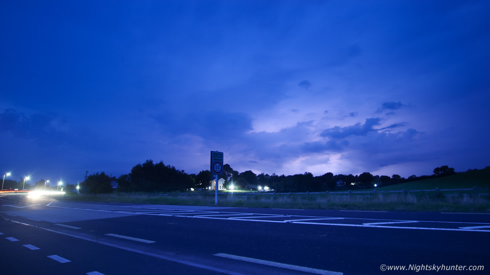 The passing traffic made for interesting photo opportunities as we could now capture light trails with the storm in our exposures. The sky was flashing and pulsing with light, it was absolutely surreal, Paul said the storm was still a good 20 miles away from us which was amazing, and what made the experience even better was that we were completely dry, there wasn't a drop of rain on us. Parts of Co. Fermanagh under the anvil were getting a remarkable show with pink and purple anvil crawlers almost constantly creeping across the sky like large electrified spiders. Power was knocked out and many said it was the 'worse' lightning they had seen since 1985.