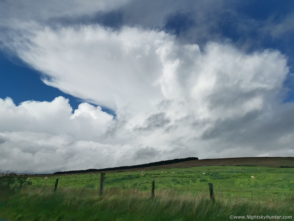 Models indicated the W and NW was the place to be, anywhere from the Sperrins to Omagh to The Foyle area and Donegal. AROME showed more cells across the S. Sperrins so we decided a decent location would be at Beaghmore Stone Circles smack bang in the middle of the target area. I packed my new power charging unit so that we could charge drone batteries on location, filled a flask, then bought some snacks then Rhua and I hit the road, we arrived at Beaghmore at 12.15 and soon after Colleen arrived also.